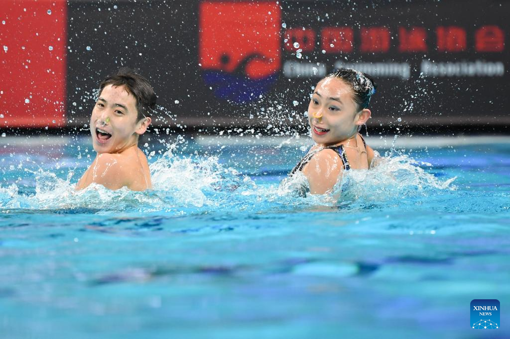 Ji Heyue(R)/Guo Muye of China compete during the mixed duet technical event at the World Aquatics Artistic Swimming World Cup 2024 in Beijing, capital of China, April 5, 2024. (Xinhua/Ju Huanzong)
