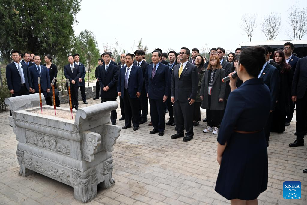Ma Ying-jeou, former chairman of the Chinese Kuomintang party, and members of a delegation of young people from Taiwan visit the tomb of Ma Yuan in Baoji City, northwest China's Shaanxi Province, April 5, 2024. A delegation of young people from Taiwan led by Ma visited the Ancestral Hall and the tomb of Ma Yuan on Friday. (Xinhua/Chen Yehua)