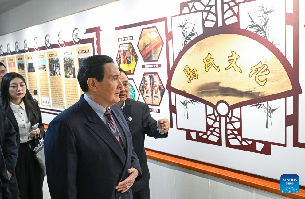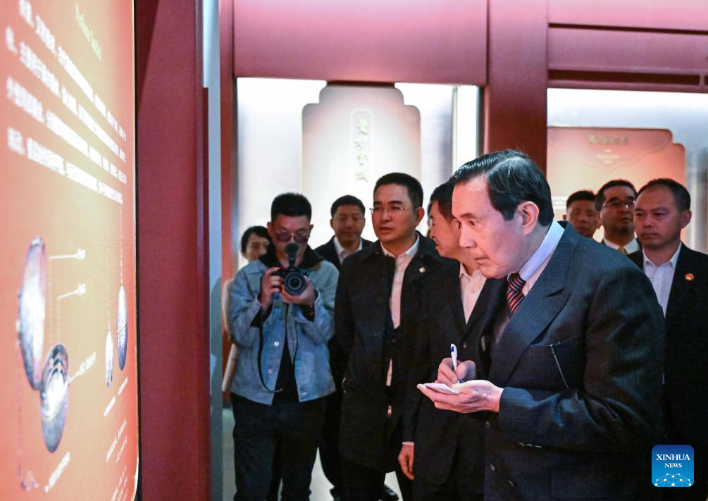 Ma Ying-jeou, former chairman of the Chinese Kuomintang party, and members of a delegation of young people from Taiwan visit a museum of the Ancestral Hall of Ma Yuan at the Yangling demonstration zone in northwest China's Shaanxi Province, April 5, 2024. A delegation of young people from Taiwan led by Ma visited the Ancestral Hall and the tomb of Ma Yuan on Friday. (Xinhua/Chen Yehua)