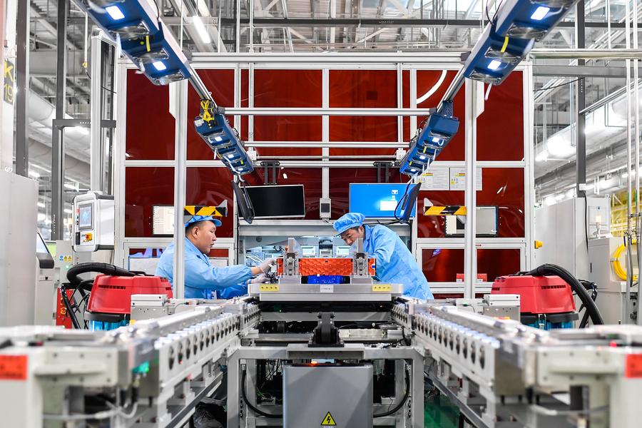 Staff members work at a battery production facility in Changchun, capital of northeast China's Jilin Province, Feb. 2, 2023. (Xinhua/Xu Chang)