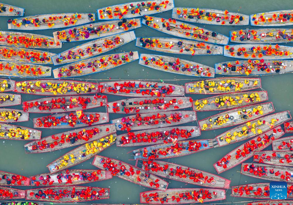 People participate in a boat performance during the 2024 Qintong Boat Festival held at Qinhu National Wetland Park in Jiangyan District of Taizhou, east China's Jiangsu Province, April 6, 2024. Hundreds of boats with more than 10,000 boat team members aboard gathered here on Saturday for the Qintong Boat Festival, which has been a centuries-old tradition. (Photo by Gu Jihong/Xinhua)