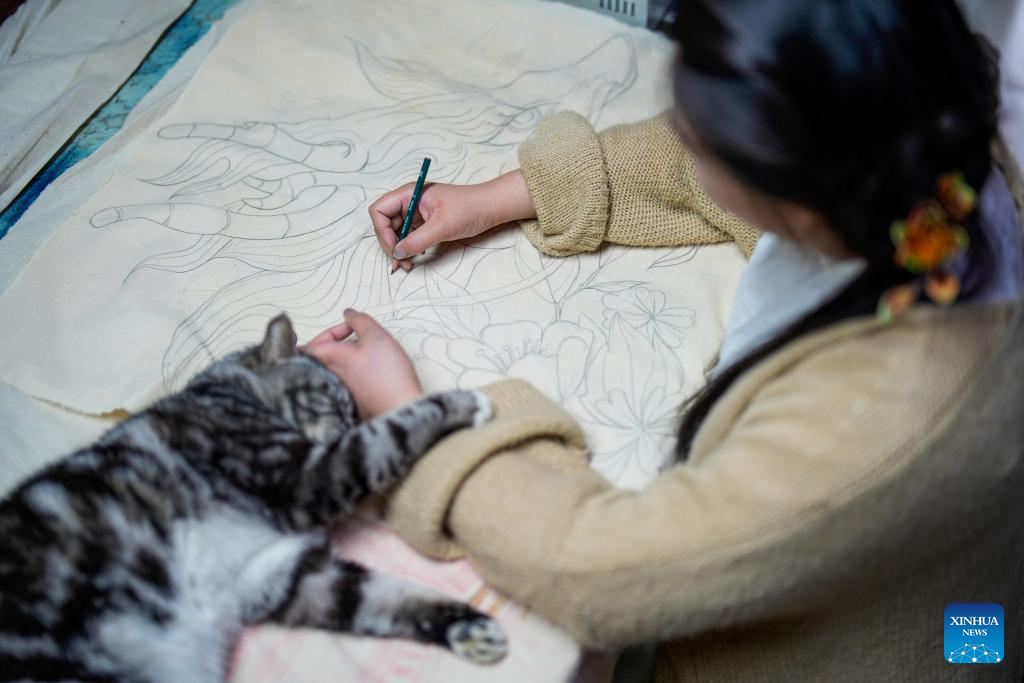 Li Sa draws a pattern for batik products in Tangshan, north China's Hebei Province, April 6, 2024.
