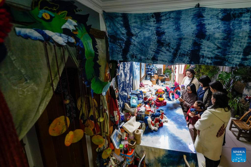 Li Sa (1st L) and her mother Gan Caiyun (2nd L) demonstrate the batik technique at her studio in Tangshan, north China's Hebei Province, April 6, 2024.