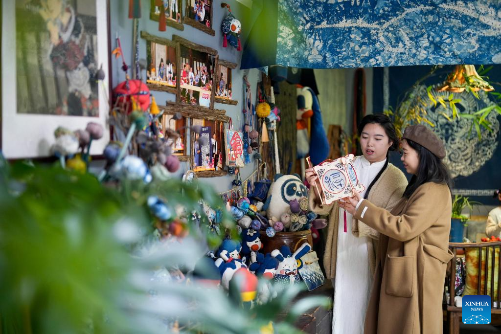 Li Sa (L) introduces a batik product to a customer at her studio in Tangshan, north China's Hebei Province, April 6, 2024.