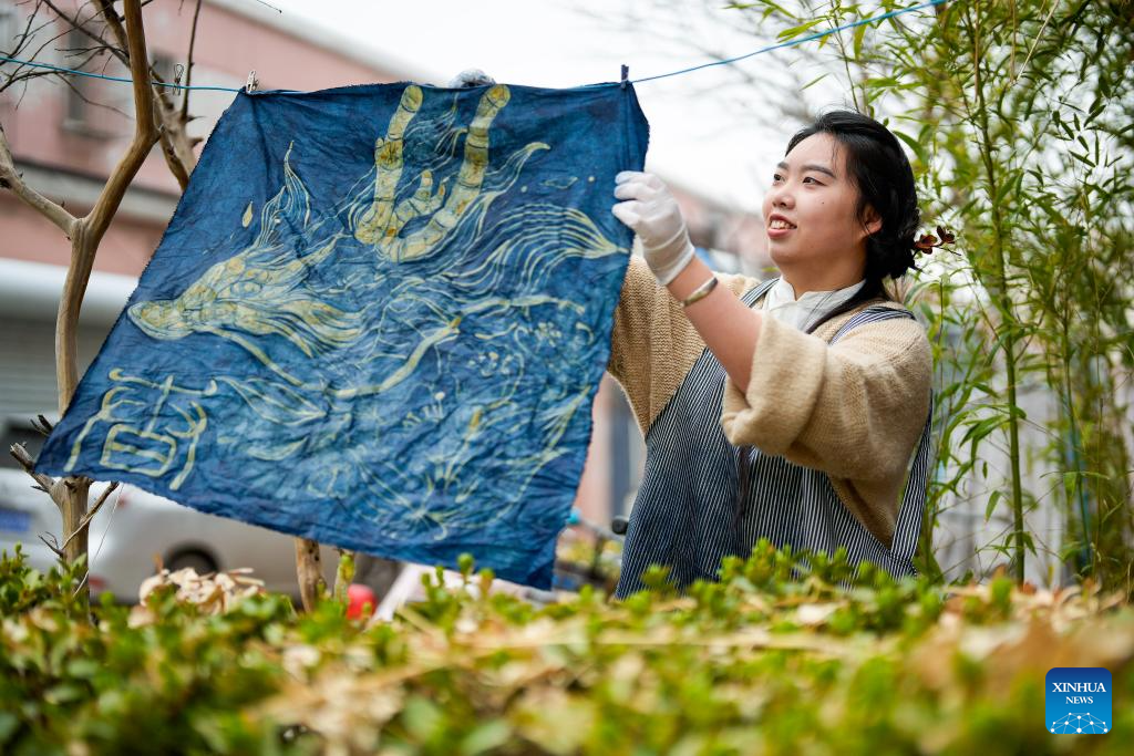 A young learner views batik products at Li Sa's studio in Tangshan, north China's Hebei Province, April 6, 2024.