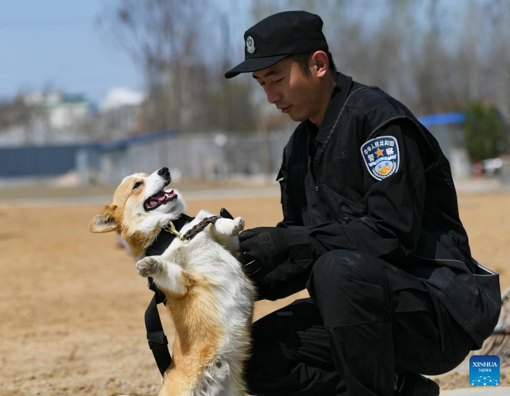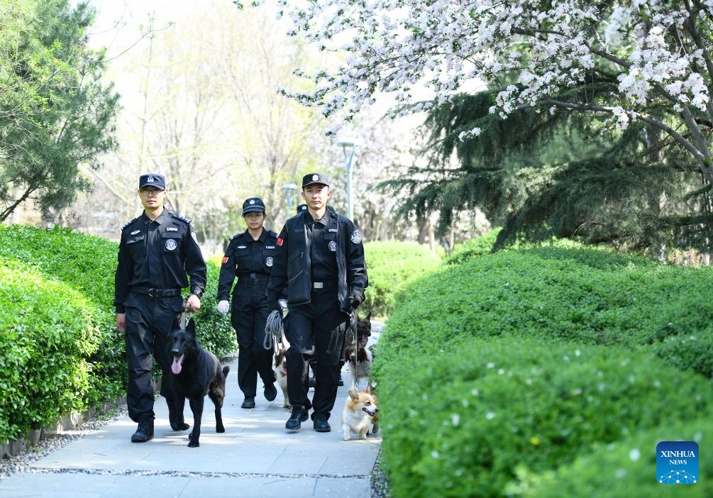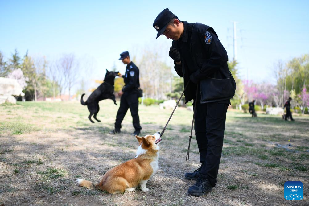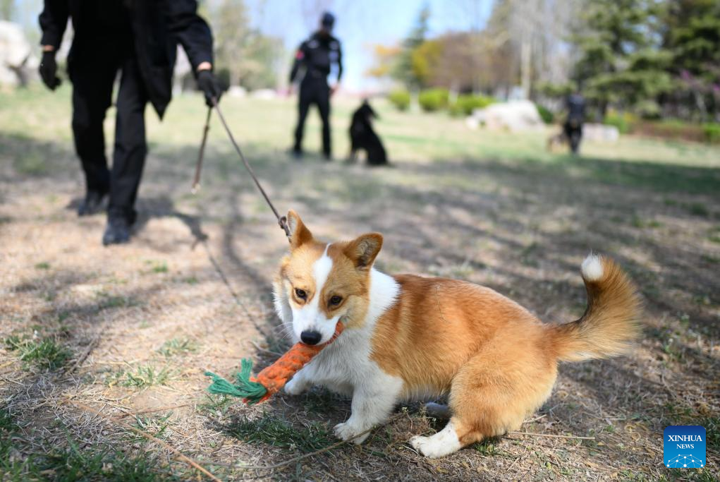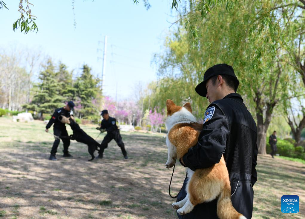 Fu Zai, a six-month-old corgi, patrols with fellow police dogs and their handlers in Weifang, east China's Shandong Province, April 7, 2024. (Photo by Sun Shubao/Xinhua)