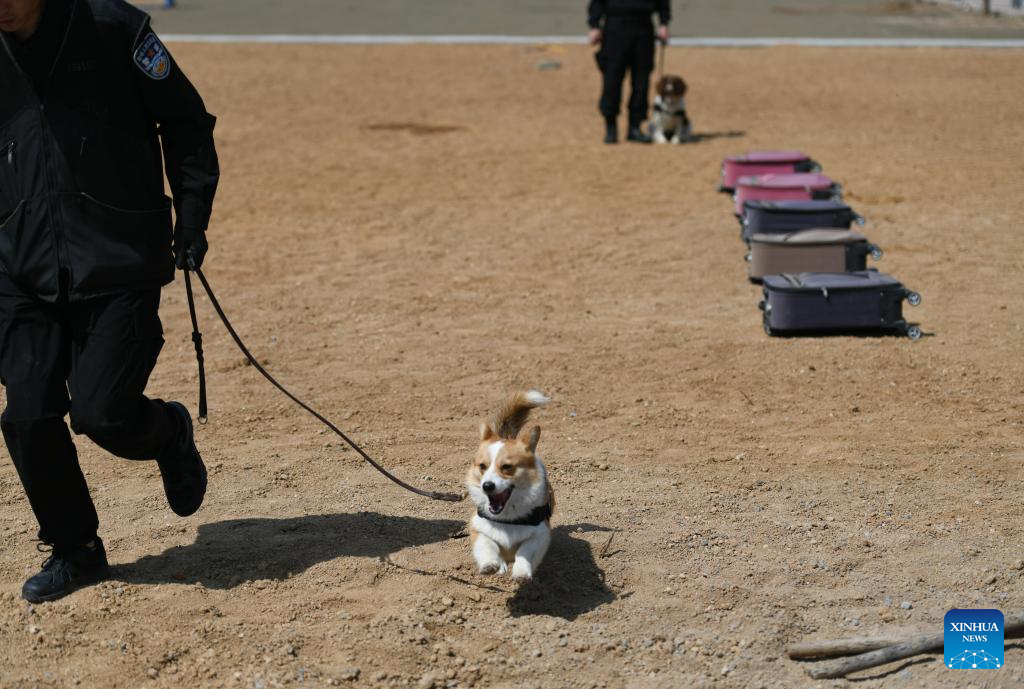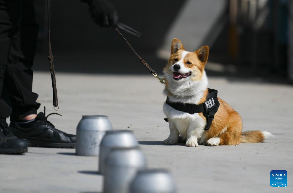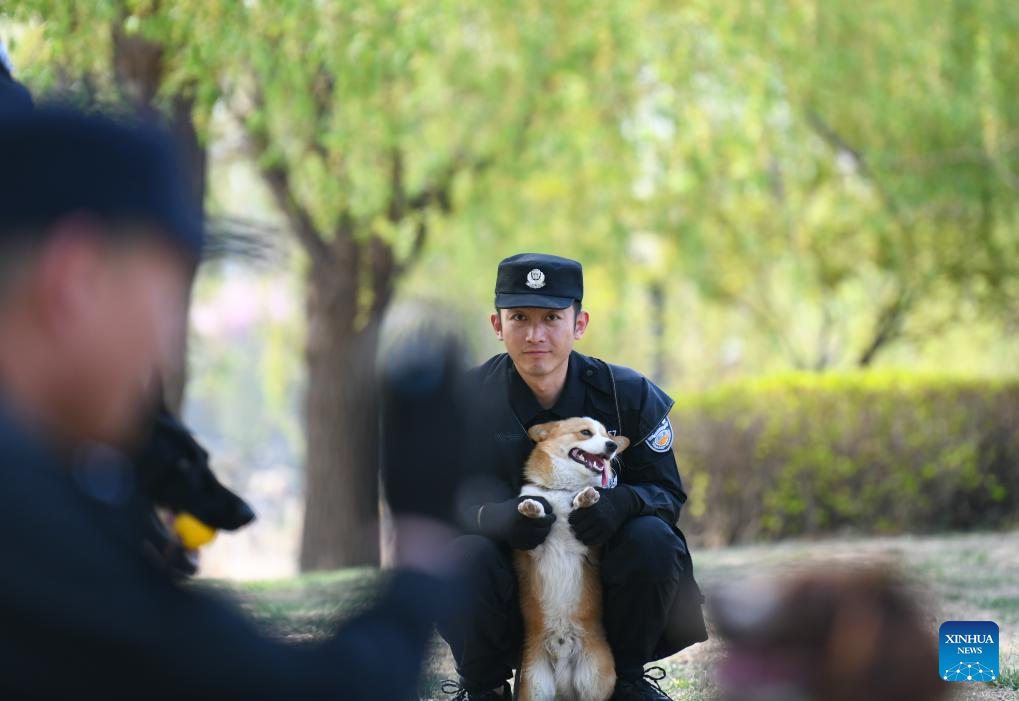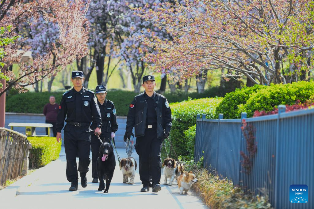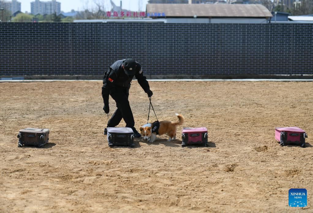 Fu Zai, a six-month-old corgi, patrols with fellow police dogs and their handlers in Weifang, east China's Shandong Province, April 7, 2024. (Photo by Sun Shubao/Xinhua)