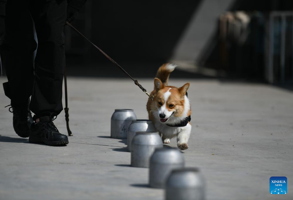 Fu Zai, a six-month-old corgi, takes part in a training session in Weifang, east China's Shandong Province, April 7, 2024. (Photo by Sun Shubao/Xinhua)