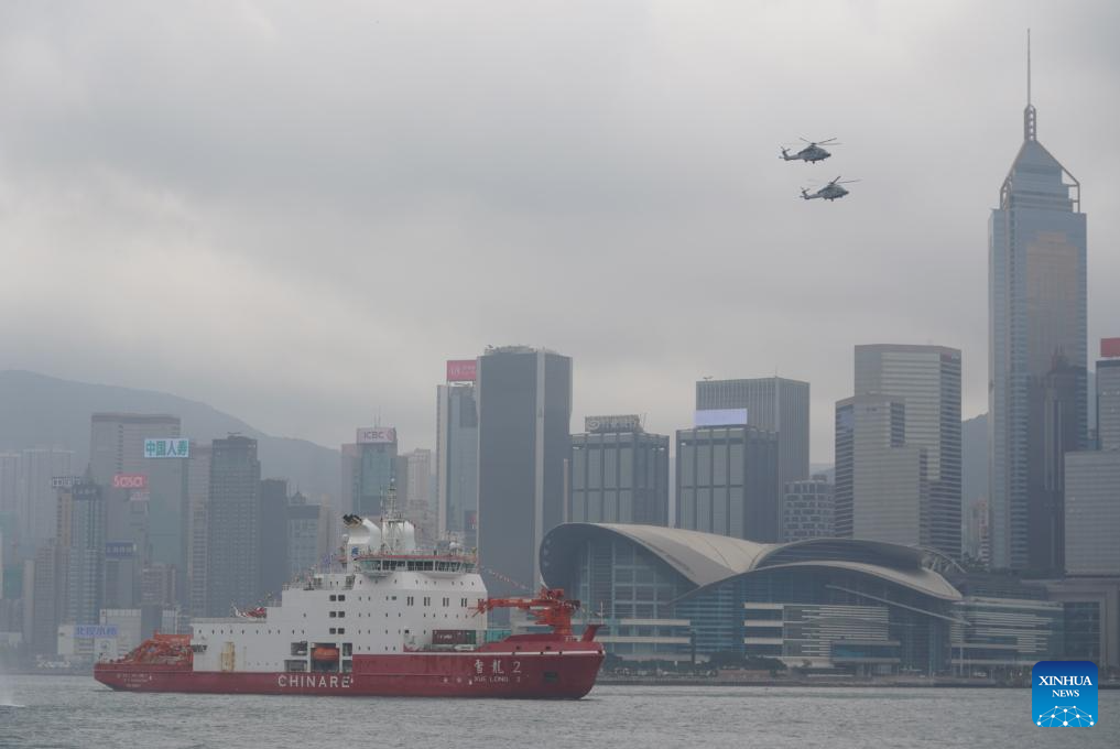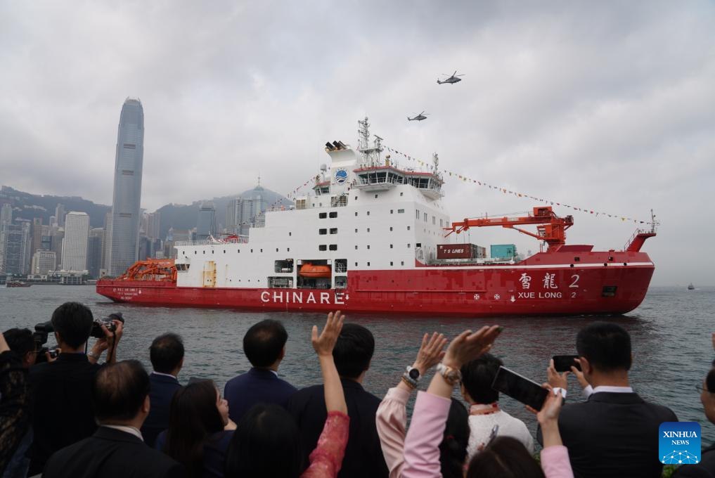 China's polar icebreaker Xuelong 2, or Snow Dragon 2, enters the Ocean Terminal in Tsim Sha Tsui, Hong Kong, south China, April 8, 2024. China's first domestically made polar icebreaker Xuelong 2, or Snow Dragon 2, arrived in Hong Kong for the very first time on Monday for a five-day visit. (Xinhua/Lui Siu Wai)