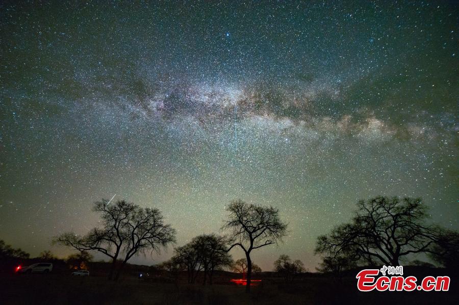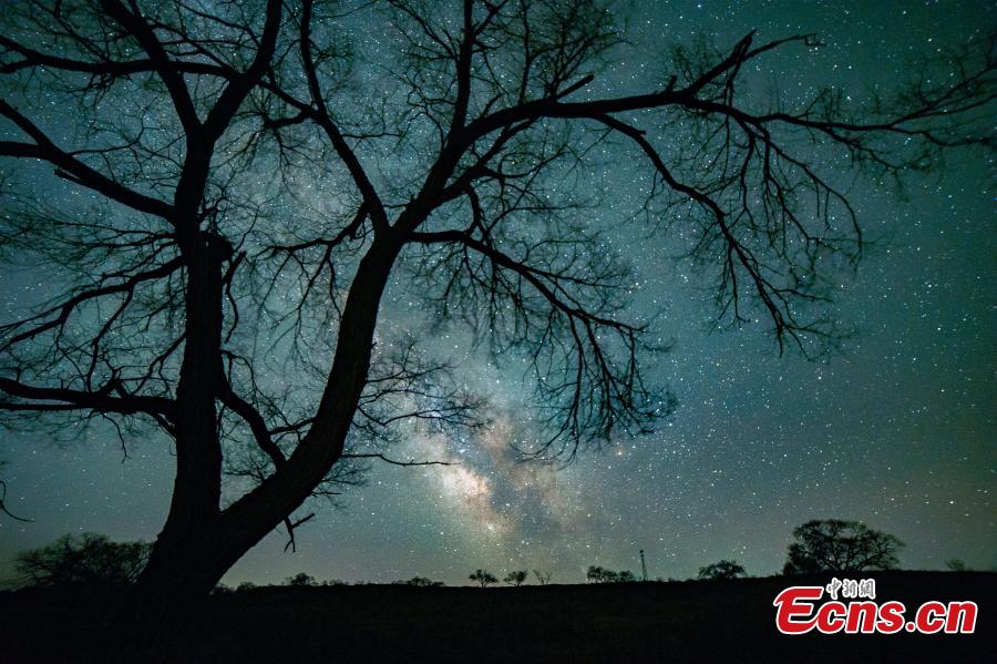 Night view of trees against the starry night with the Milky Way galaxy over a sand field in Xilingol League, north China's Inner Mongolia Autonomous Region. (Photo: China News Service/Guan Yongxin)