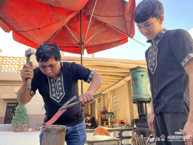 Photo taken on Sept. 5, 2023 shows a man making a Yengisar knife in Kalabashilan'gan village of Yengisar county, northwest China’s Xinjiang Uygur Autonomous Region. (Photo/ts.cn)