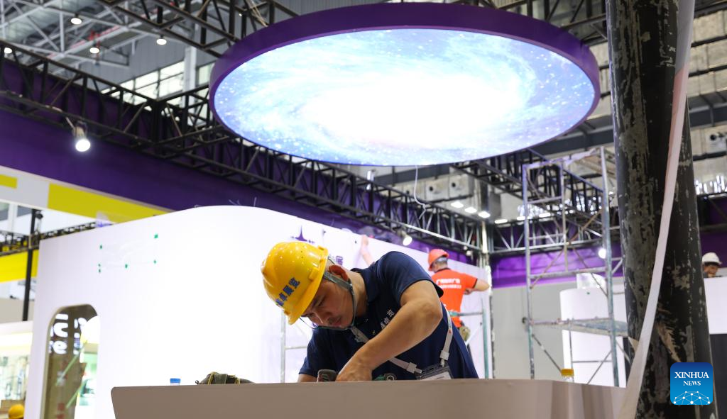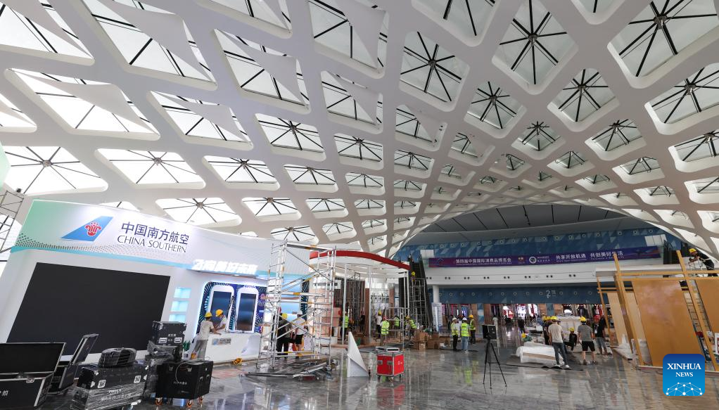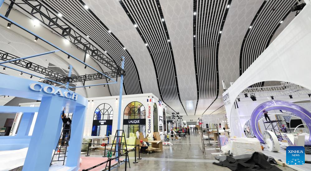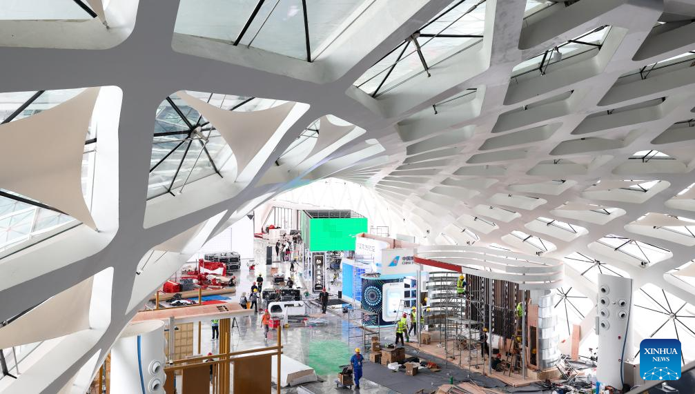 Workers perform tasks at Hainan International Convention and Exhibition Center, the main venue for the upcoming fourth China International Consumer Products Expo, in Haikou, south China's Hainan Province, April 8, 2024. (Xinhua/Yang Guanyu)