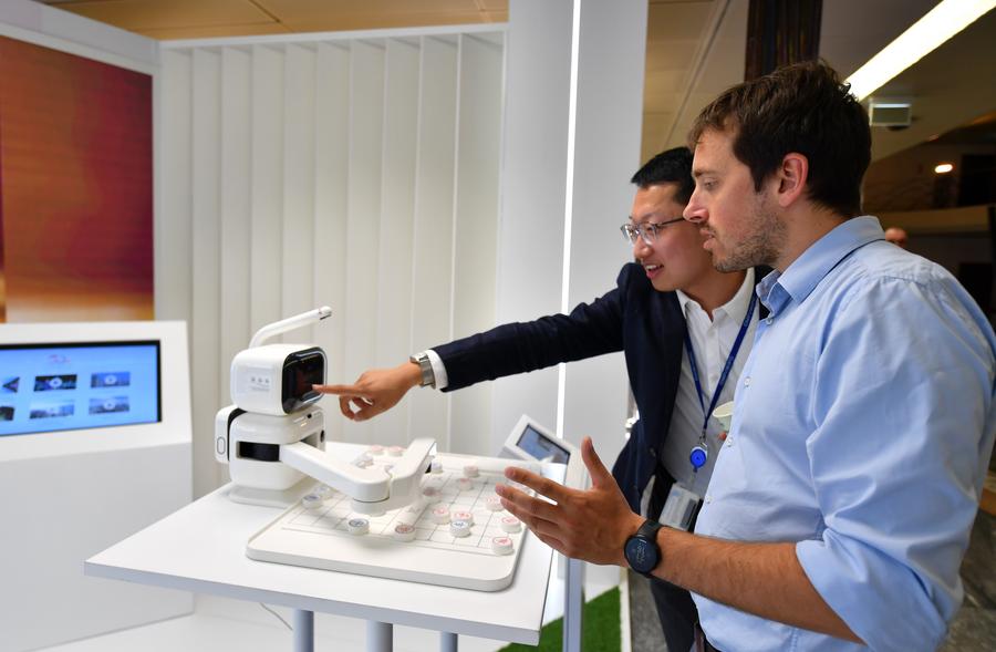 A participant competes with an AI chess robot in the game of Chinese chess during activities marking the 50th anniversary of cooperation between China and the World Intellectual Property Organization (WIPO) in Geneva, Switzerland, on July 6, 2023. (Xinhua/Lian Yi)