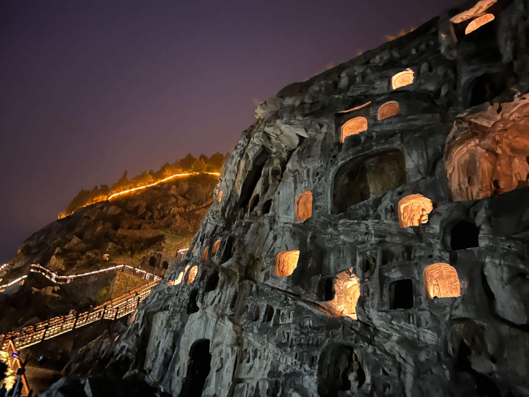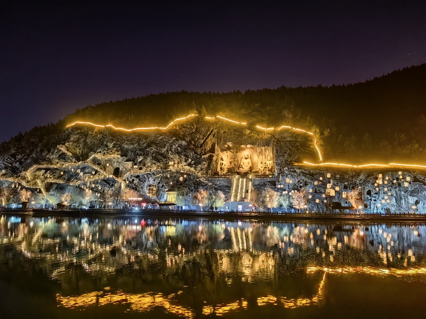 As night falls, the cliffs of the Longmen Grottoes in Luoyang, central China's Henan Province, are bathed in the soft glow of yellow lights, illuminating the Buddhist statues and niches along the banks of the Yi River.