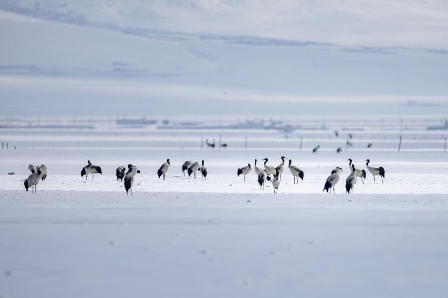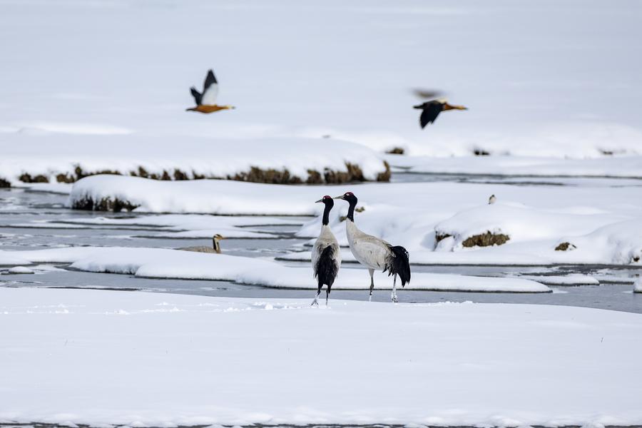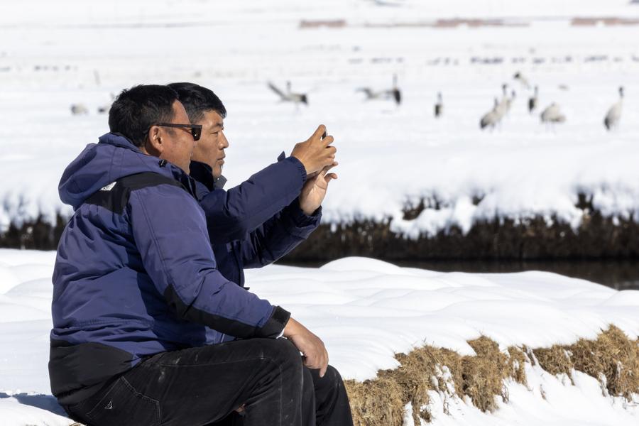 Now, over 70 black-necked crane observation areas have been established in Xizang. The population of the species has gradually increased over the years, rising from under 3,000 in 1995 to over 10,000 now.