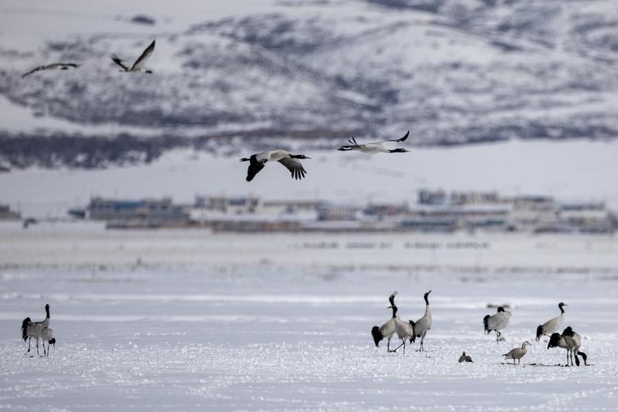 LHASA, April 9 (Xinhua) -- The black-necked cranes, a species under first-class state protection in China, stop by and forage at the A Rag Wetland in Damxung County of Lhasa, southwest China's Xizang Autonomous Region, during their returning journey to the north every spring. It is the busiest period of the year for the wildlife conservationists of the county.