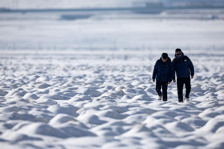 Nyima Dondrup (R) and his colleague Tashi Dondrup patrol at the A Rag Wetland after snowfall in Damxung County of Lhasa, southwest China's Xizang Autonomous Region, April 7, 2024. (Xinhua/Jiang Fan)