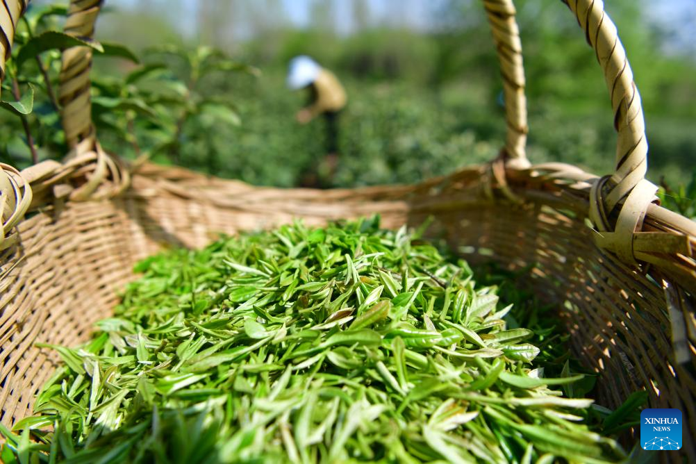 This photo taken on April 9, 2024 shows picked tea leaves at a tea garden in Feixi County of Hefei City, east China's Anhui Province. As spring unfolds, tea gardens across the region have entered the harvest season. (Photo by Xu Yong/Xinhua)