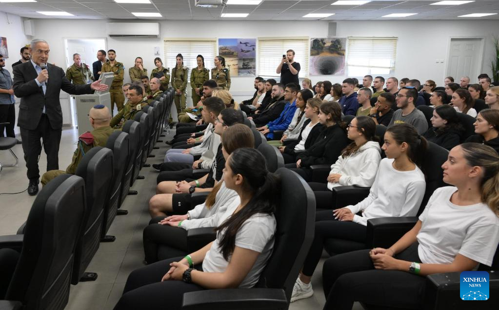 Israeli Prime Minister Benjamin Netanyahu addresses newly enlisted soldiers in a military base outside Tel Aviv, Israel, on April 9, 2024. Netanyahu said on Tuesday that Israel will launch an offensive against Hamas in Gaza's Rafah and "no power in the world" could prevent it. (Amos Ben-Gershom/GPO/Handout via Xinhua)