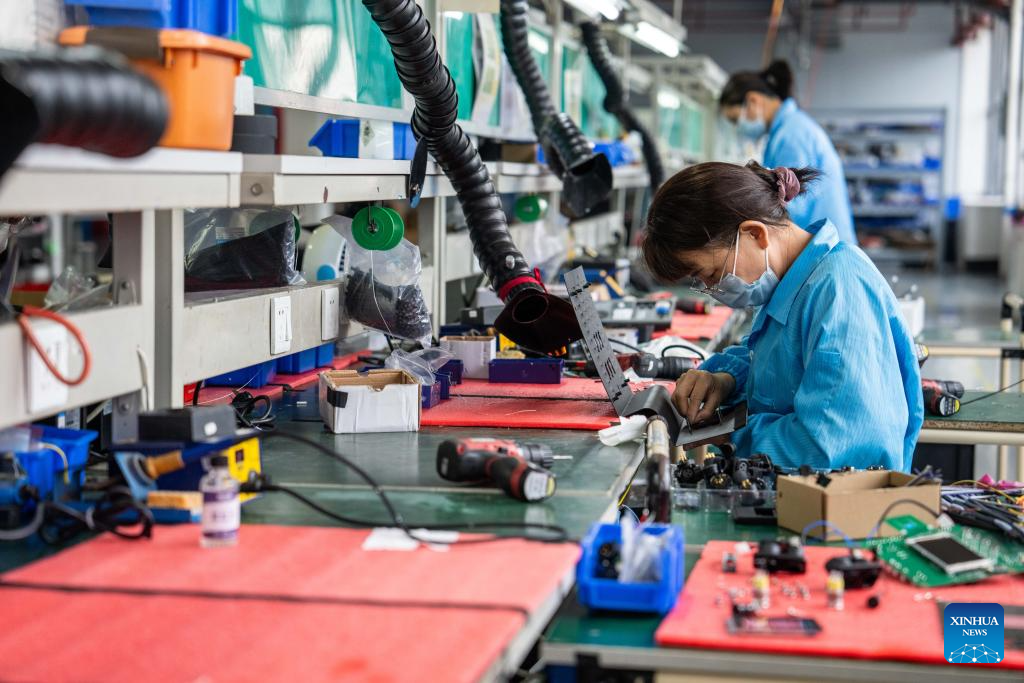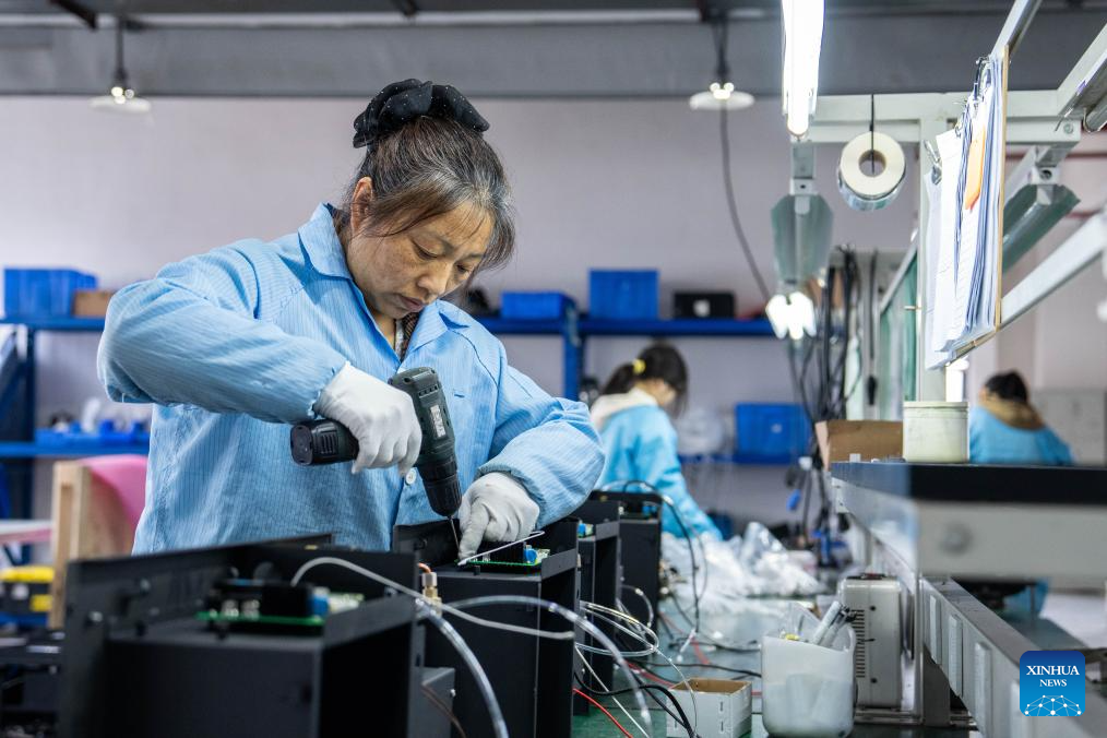 A worker makes electronic firework equipment at Showven, a leading manufacturer and supplier of high-end stage special effects products and solutions, in Liuyang City, central China's Hunan Province, April 9, 2024. (Xinhua/Chen Sihan)