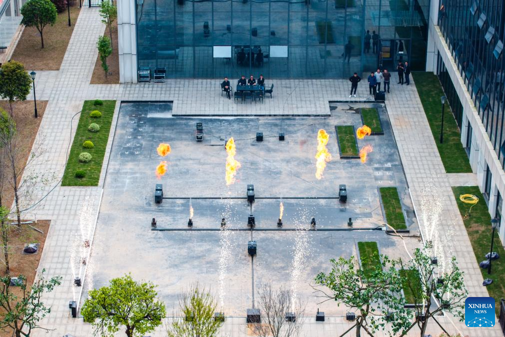 A drone photo shows workers testing electronic firework equipment at Showven, a leading manufacturer and supplier of high-end stage special effects products and solutions, in Liuyang City, central China's Hunan Province, April 9, 2024. (Xinhua/Chen Sihan)
