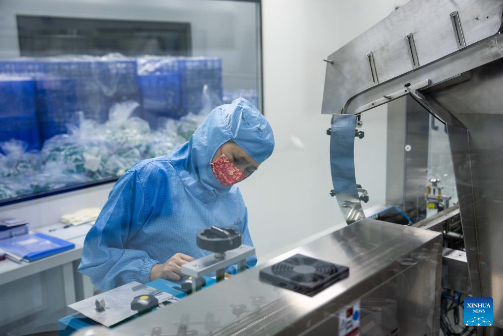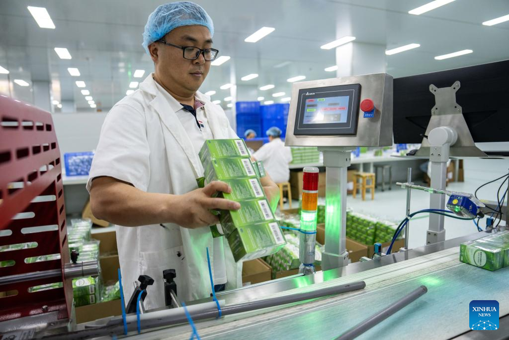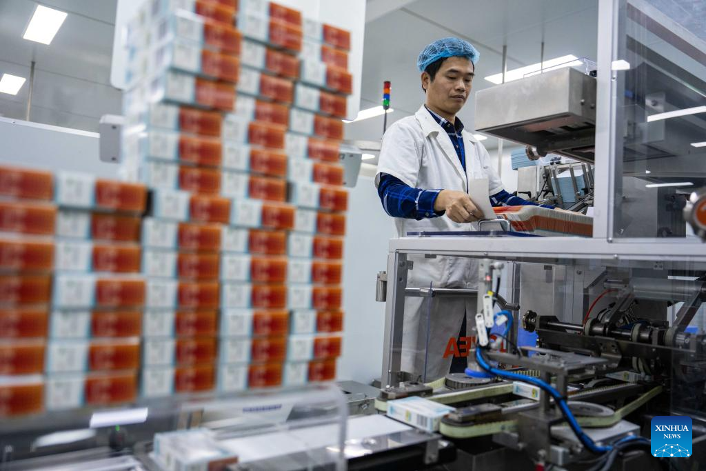 A worker packs medicines at Hunan Warrant Chiral Pharmaceutical Co., Ltd, in Liuyang City, central China's Hunan Province, April 9, 2024. (Xinhua/Chen Sihan)