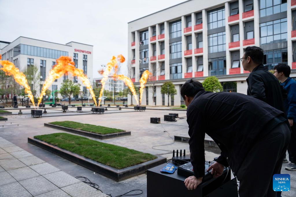 Workers test electronic firework equipment at Showven, a leading manufacturer and supplier of high-end stage special effects products and solutions, in Liuyang City, central China's Hunan Province, April 9, 2024. (Xinhua/Chen Sihan)