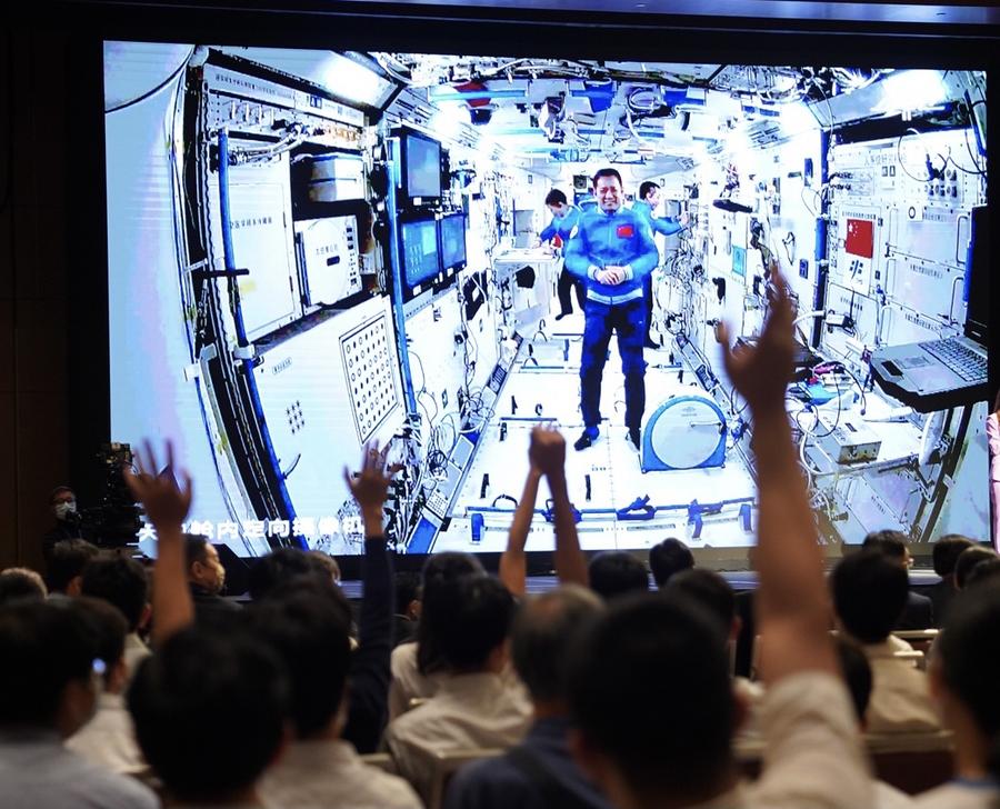 Taikonauts in the Tiangong space station talk with Hong Kong researchers, teachers and students via video link, Sept. 3, 2021. (Xinhua/Lui Siu Wai)