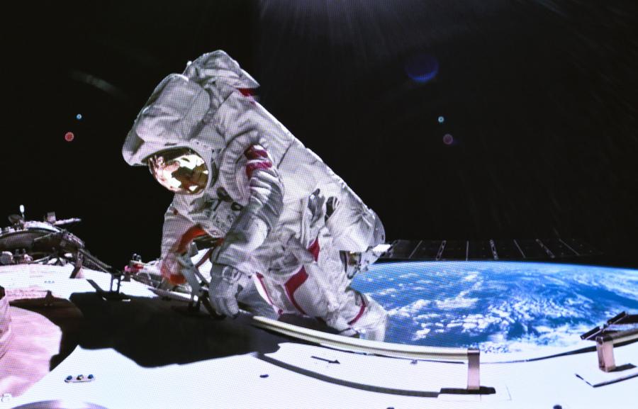 This screen image captured at Beijing Aerospace Control Center on March 2, 2024 shows Shenzhou-17 taikonaut Tang Hongbo performing extravehicular activities. (Xinhua/Li He)