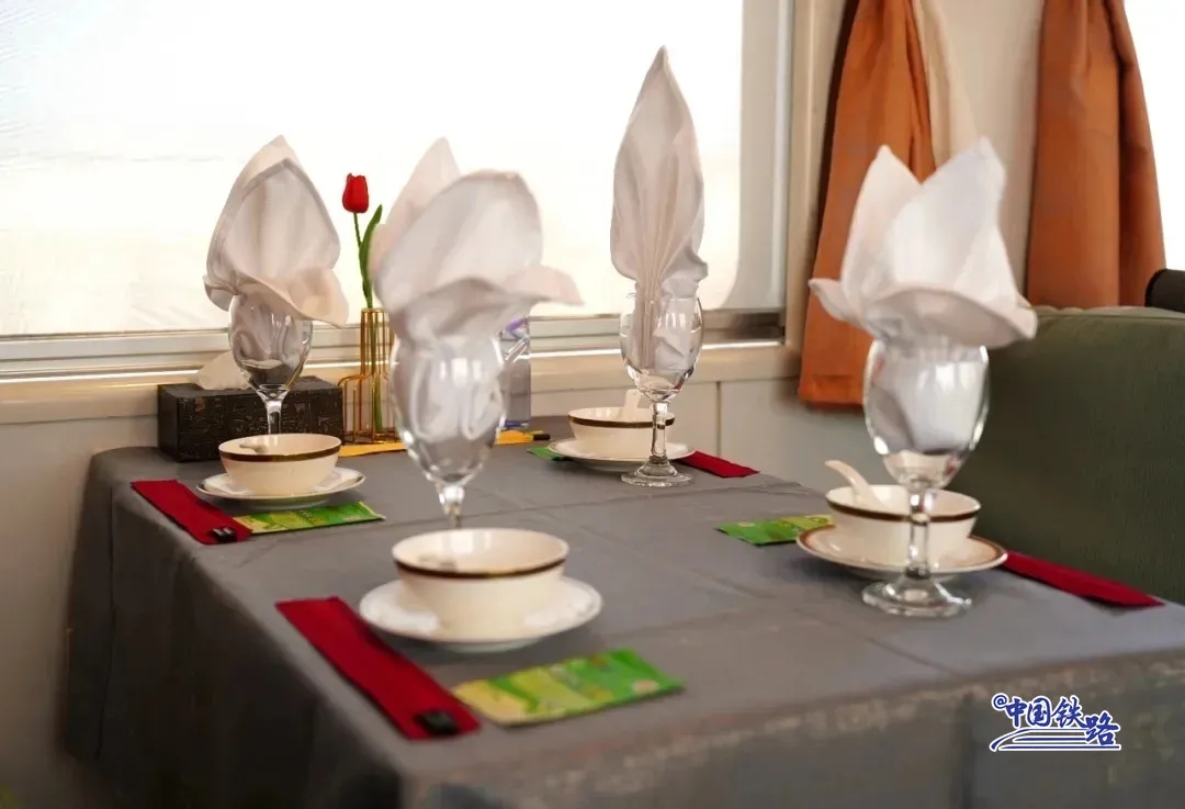 The dining car of the train offers a gourmet experience with delicacies incorporating local specialties created by chefs. Visitors can also enjoy private dining room services, with each meal consisting of eight dishes and one soup, accompanied by beer, wine, and champagne.