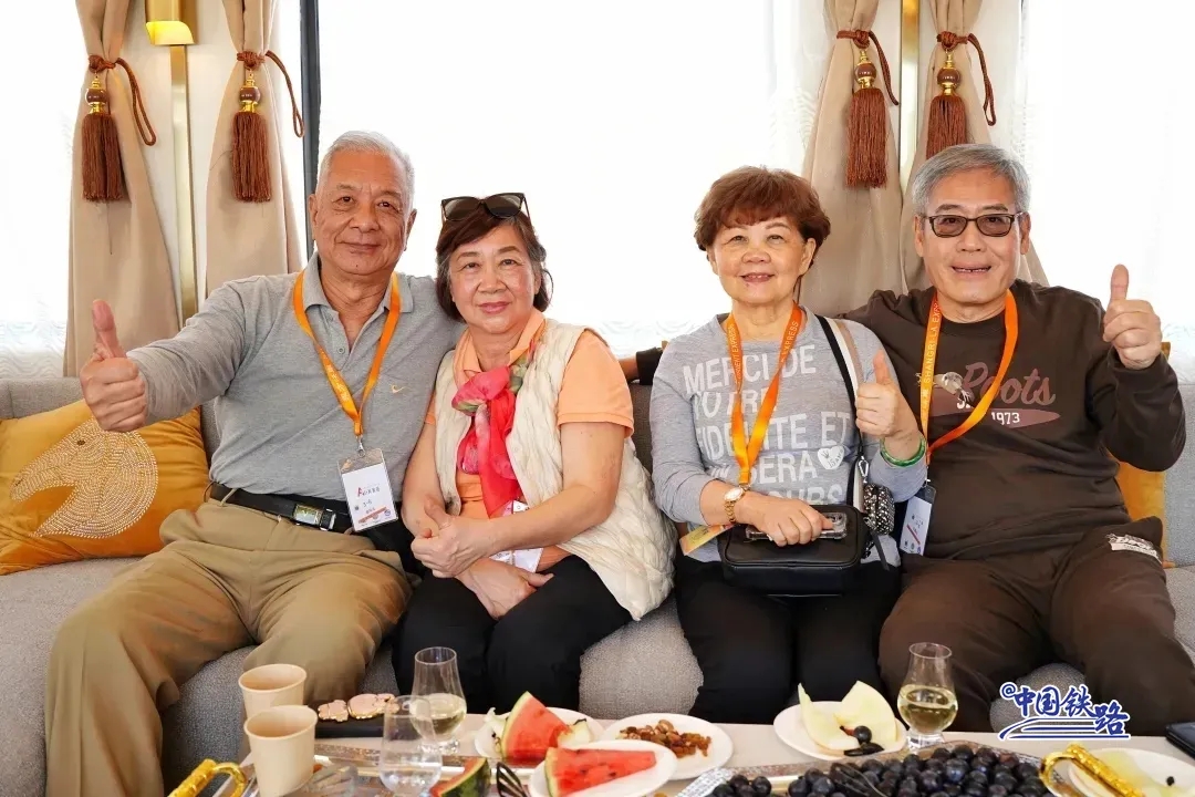 Tourists pose for a group photo onboard a New Orient Express tourist-dedicated train. (Photo from the media convergence center of China Railway Urumqi Bureau Group Co., Ltd.)