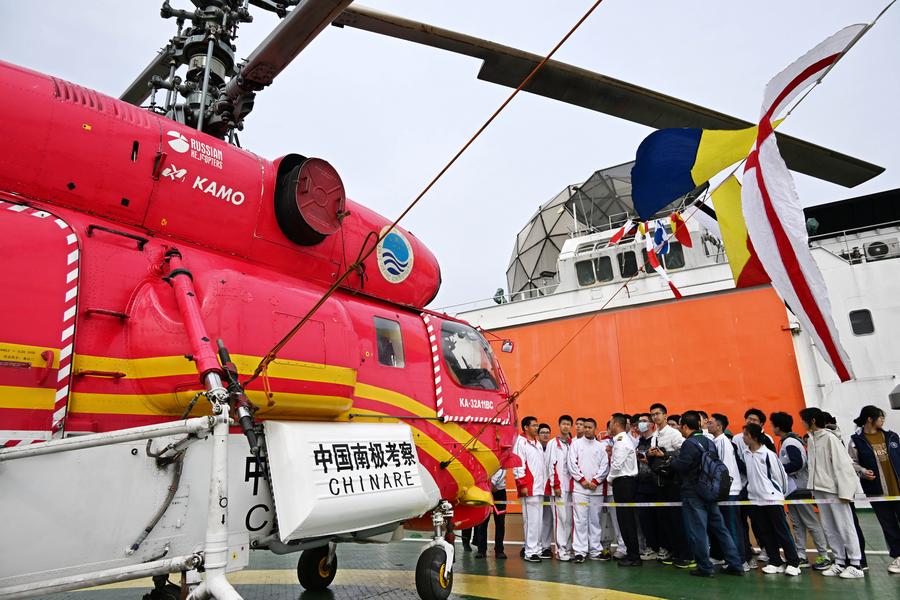 People visit the icebreaker Xuelong at a port in Qingdao, east China's Shandong Province, April 10, 2024. (Xinhua/Li Ziheng)