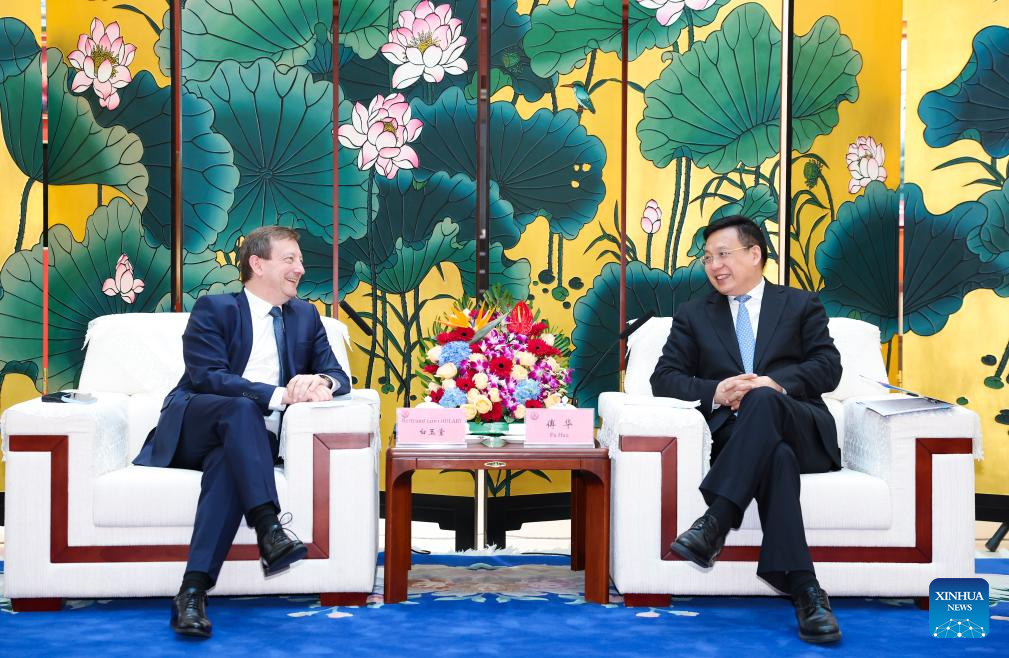President of Xinhua News Agency Fu Hua meets with French ambassador to China Bertrand Lortholary in Beijing, capital of China, April 9, 2024. (Xinhua/Huang Jingwen)