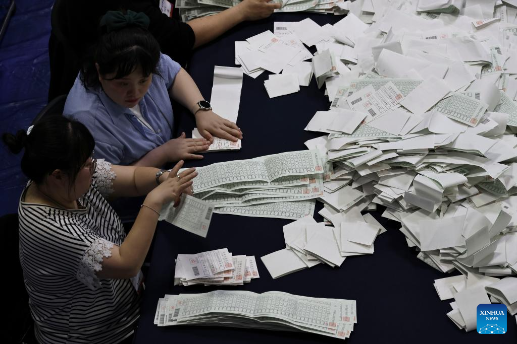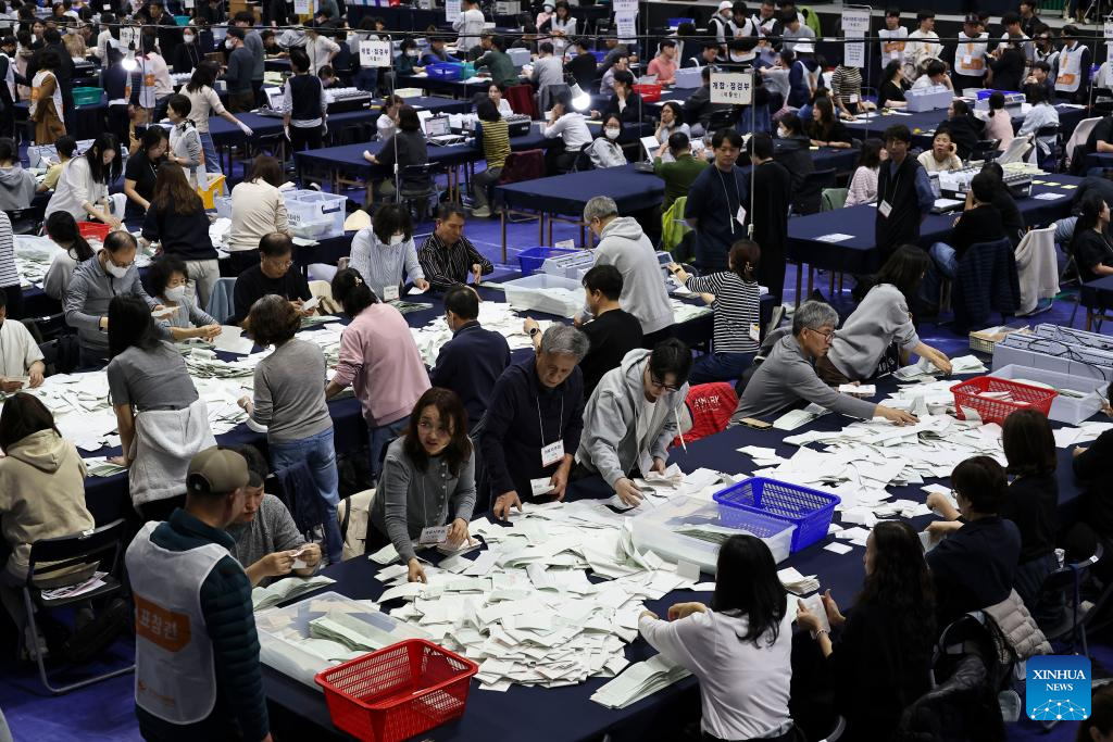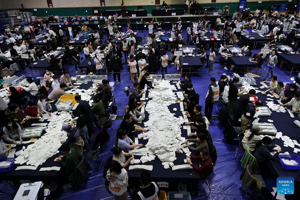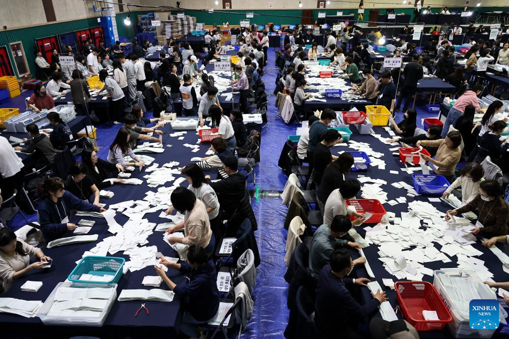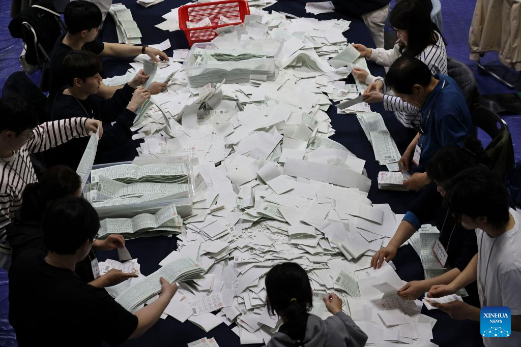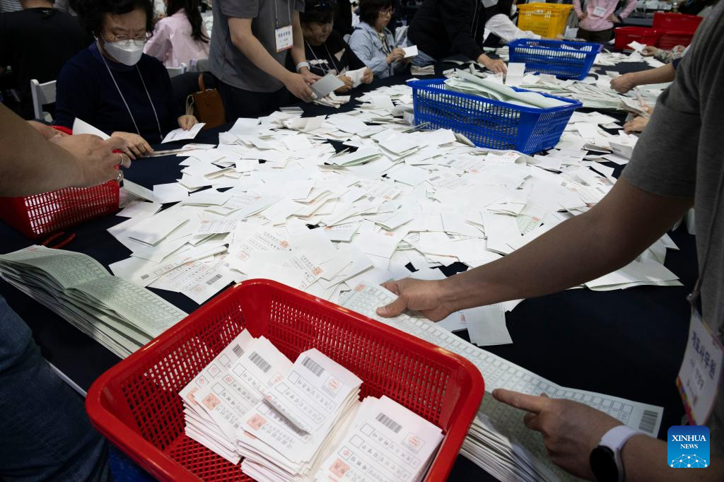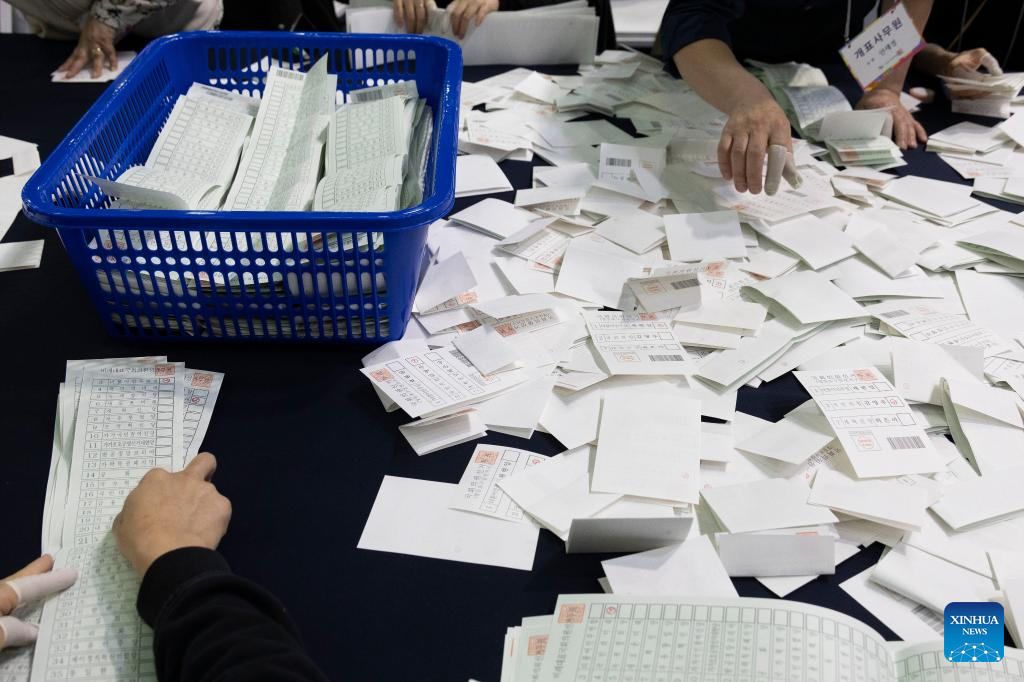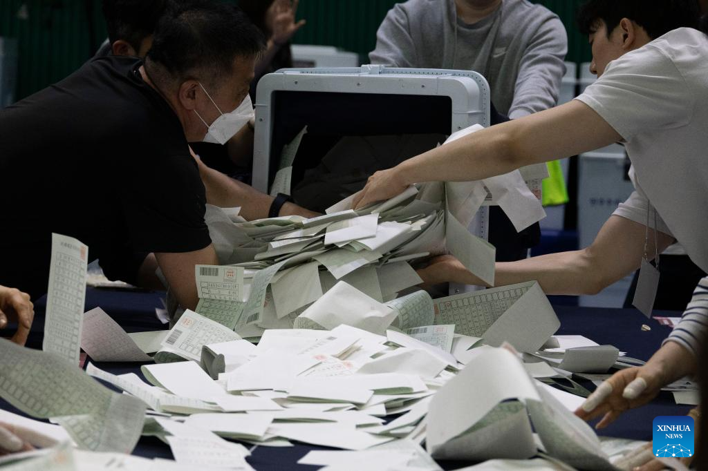 Staff members count ballots at a ballot counting station in Seoul, South Korea, April 10, 2024. South Koreans on Wednesday went to the polls for parliamentary elections to vote for 300 members of the National Assembly. (Photo by Jun Hyosang/Xinhua)