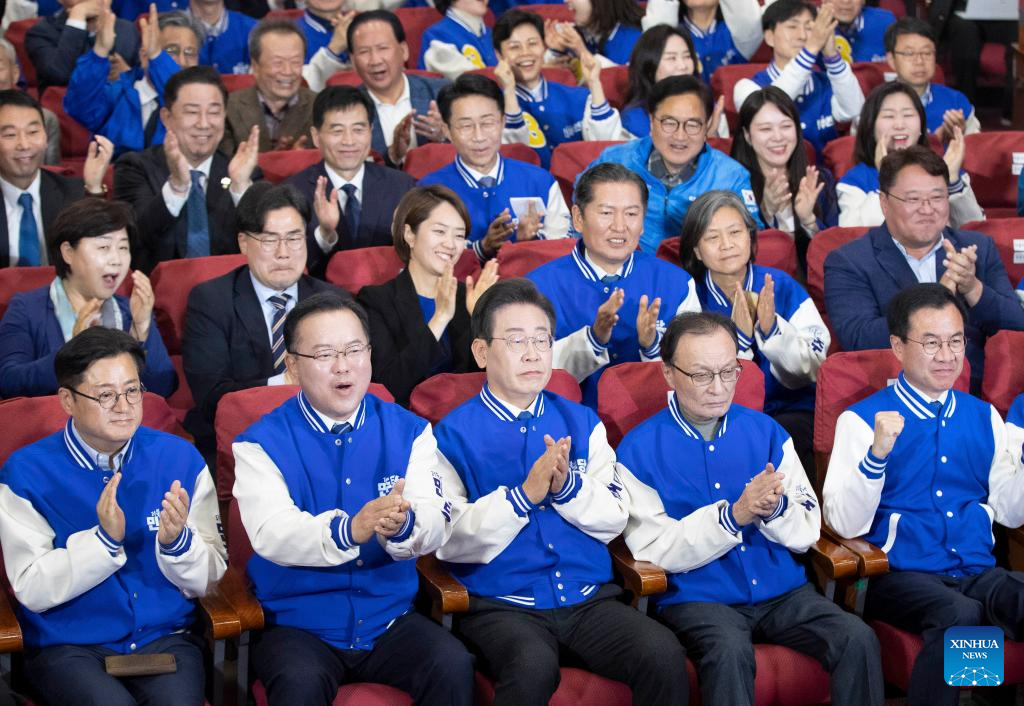 Lee Jae-myung (C front), leader of South Korea's main opposition Democratic Party, celebrates the leading in exit polls in the parliamentary elections with other leaders of the party in Seoul, South Korea, April 10, 2024. South Korea's main liberal opposition Democratic Party overwhelmingly led exit polls in parliamentary elections, a survey from three local broadcasters showed Wednesday. (Xinhua/Yao Qilin)