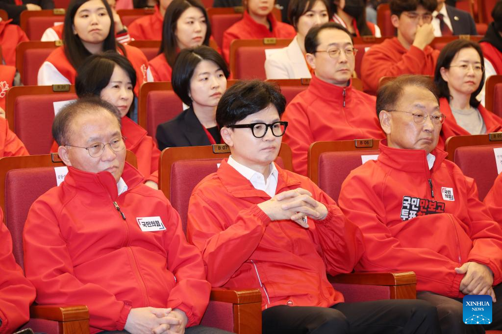 Han Dong-hoon (C front), leader of the ruling People Power Party, watches results of exit polls in the parliamentary elections in Seoul, South Korea, April 10, 2024. South Korea's main liberal opposition Democratic Party overwhelmingly led exit polls in parliamentary elections, a survey from three local broadcasters showed Wednesday. (NEWSIS via Xinhua)