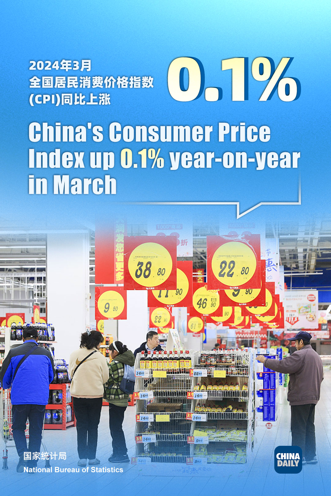 The country's consumer price index, a main gauge of inflation, rose by 0.1 percent year-on-year in March, cooling from the 0.7 percent annual gain in February, the National Bureau of Statistics said.