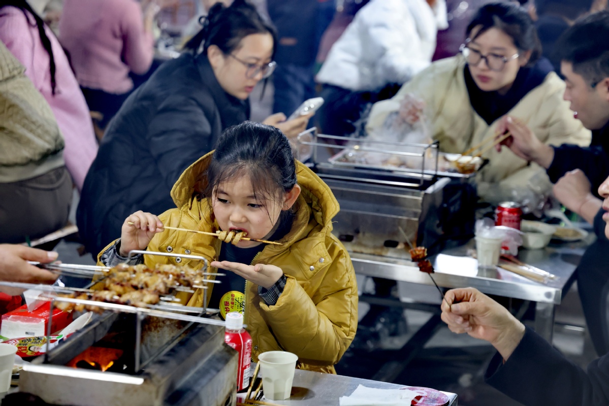 Customers enjoy barbecue skewers at a diner in Zibo in February. [WANG JING/CHINA DAILY]
