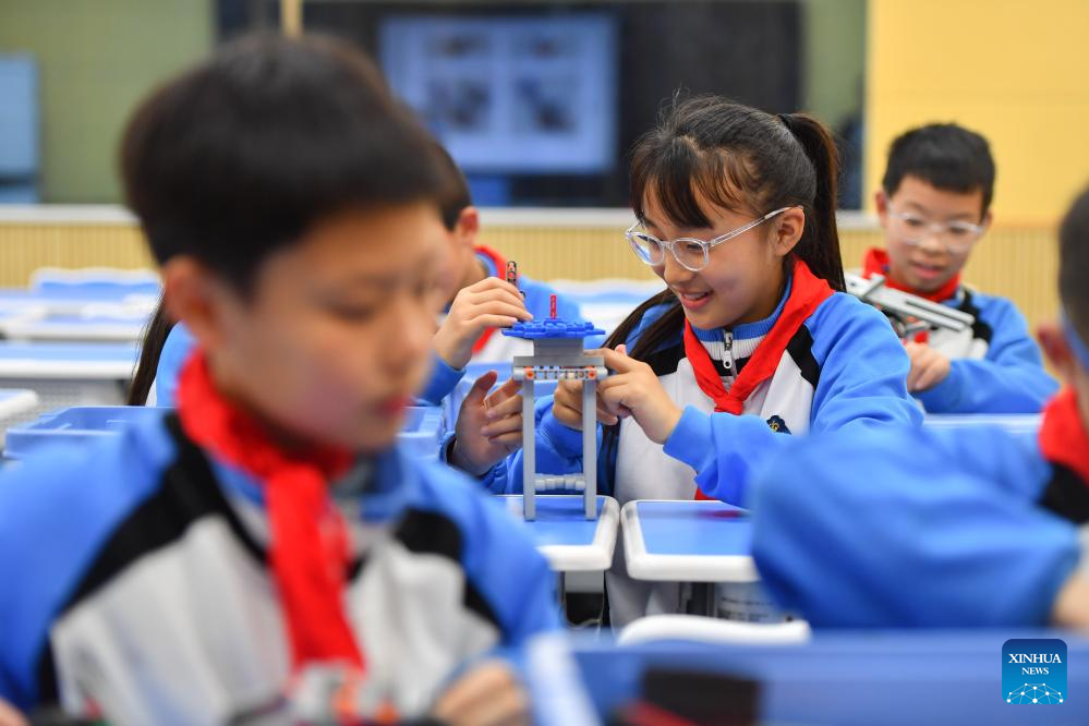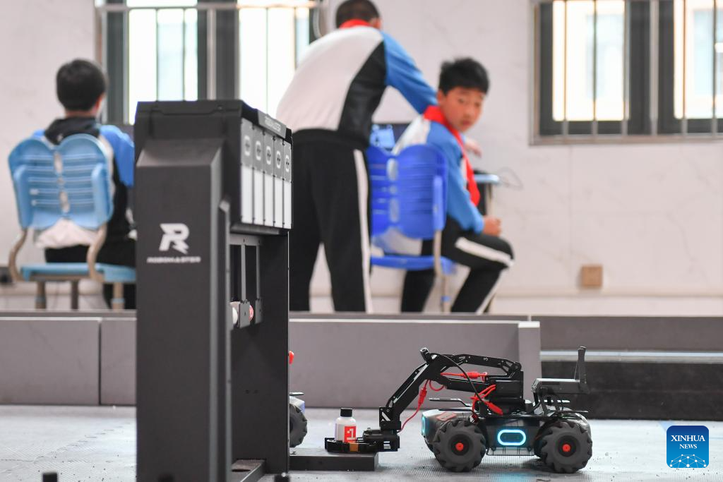 Students take part in a simulated competition on robotics at a primary school in Yuhu District of Xiangtan City, central China's Hunan Province, April 11, 2024. In order to improve the science knowledge of local students, lessons related to scientific skills, such as robotics, programming, drones, etc., were introduced into the curriculum at a primary school in Xiangtan. (Xinhua/Chen Zeguo)