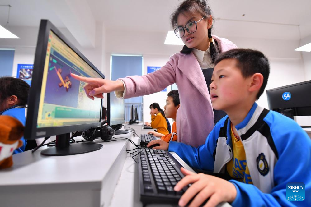 A teacher instructs as a student uses a computer in a programming class at a primary school in Yuhu District of Xiangtan City, central China's Hunan Province, April 11, 2024. In order to improve the science knowledge of local students, lessons related to scientific skills, such as robotics, programming, drones, etc., were introduced into the curriculum at a primary school in Xiangtan. (Xinhua/Chen Zeguo)