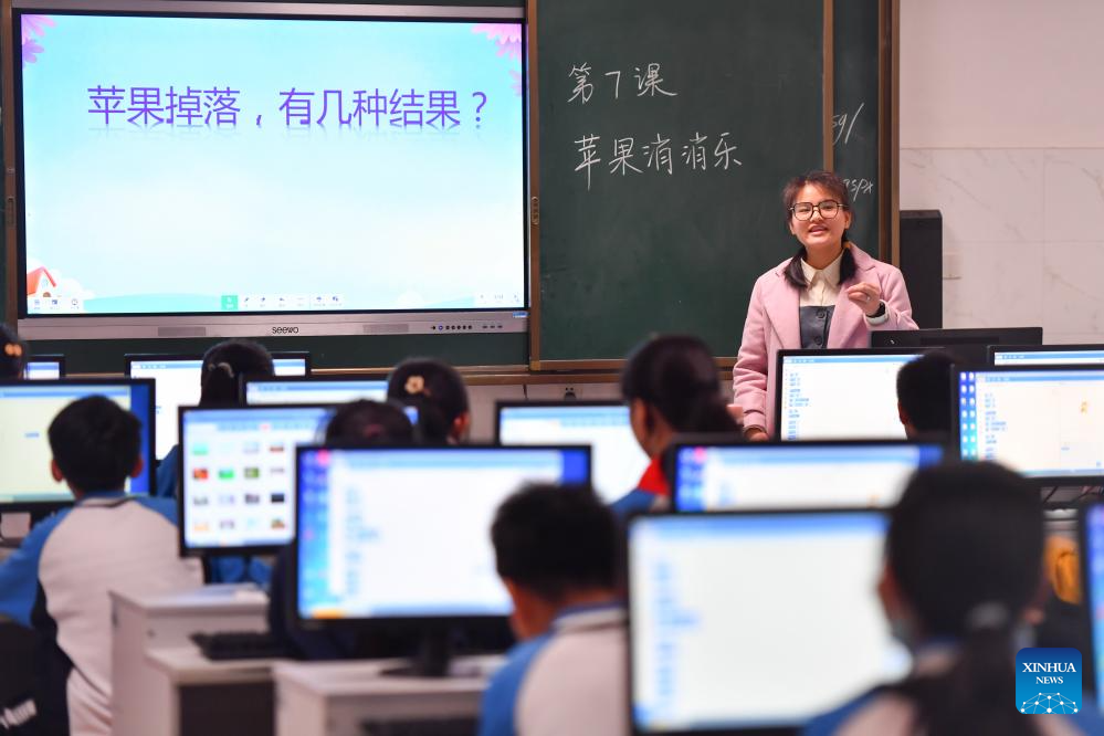 A teacher speaks during a programming class at a primary school in Yuhu District of Xiangtan City, central China's Hunan Province, April 11, 2024. In order to improve the science knowledge of local students, lessons related to scientific skills, such as robotics, programming, drones, etc., were introduced into the curriculum at a primary school in Xiangtan. (Xinhua/Chen Zeguo)