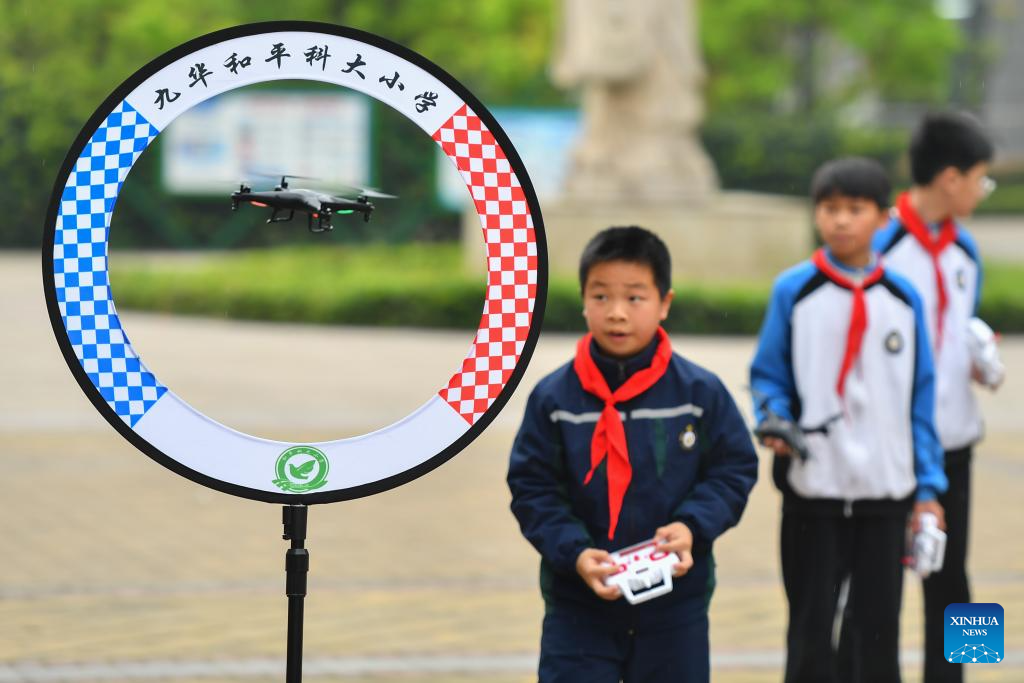 Students control a drone at a primary school in Yuhu District of Xiangtan City, central China's Hunan Province, April 11, 2024. In order to improve the science knowledge of local students, lessons related to scientific skills, such as robotics, programming, drones, etc., were introduced into the curriculum at a primary school in Xiangtan. (Xinhua/Chen Zeguo)