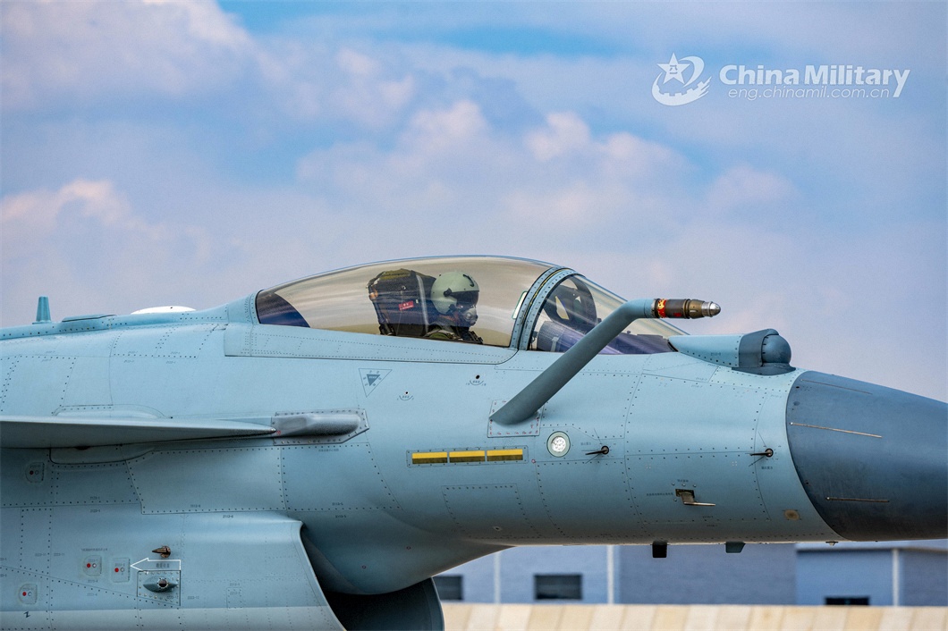 A pilot assigned to an aviation brigade with the air force under PLA Southern Theater Command taxies his J-10 fighter jet on the runway during a round-the-clock flight training exercise on March 26, 2023. (eng.chinamil.com.cn/Photo by Shang Jieyan)