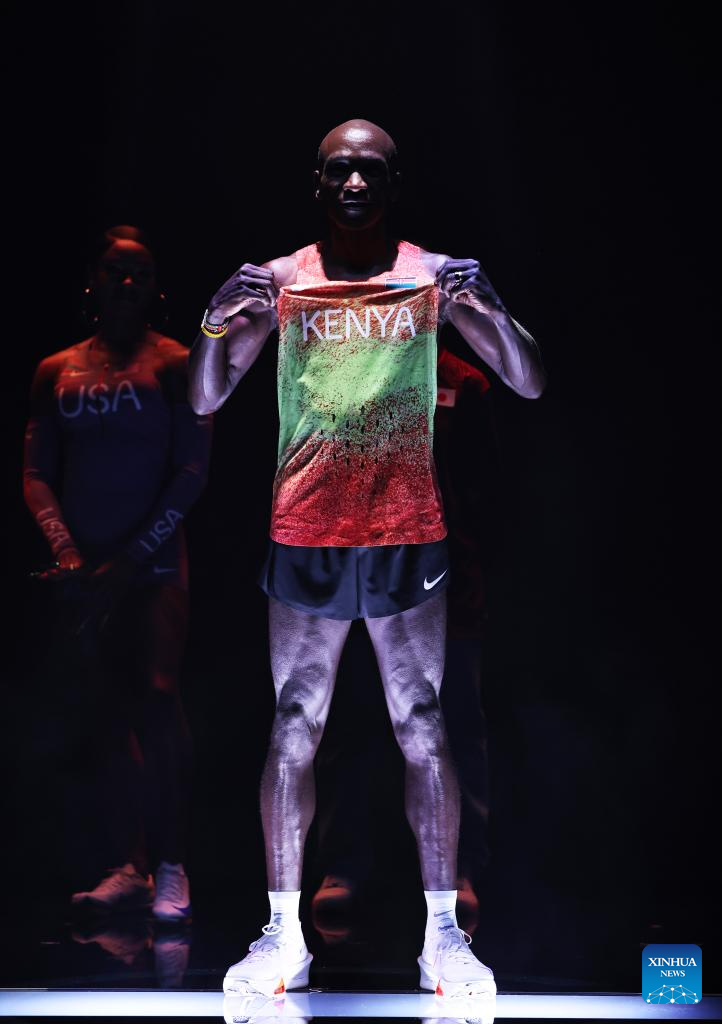 Marathon runner Eliud Kipchoge of Kenya presents Nike Olympics Products during a Paris Olympics kits unveiling event held by Nike in Paris, France, April 11, 2024. (Xinhua/Gao Jing)