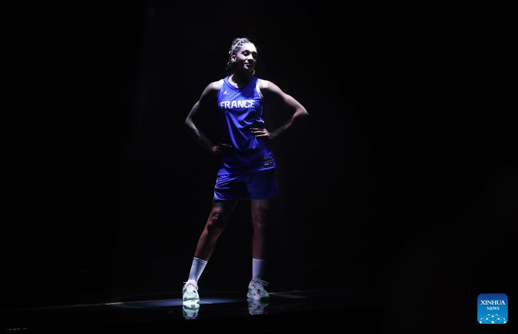 Basketball player Gabby Williams of France presents Nike Olympics Products during a Paris Olympics kits unveiling event held by Nike in Paris, France, April 11, 2024. (Xinhua/Gao Jing)