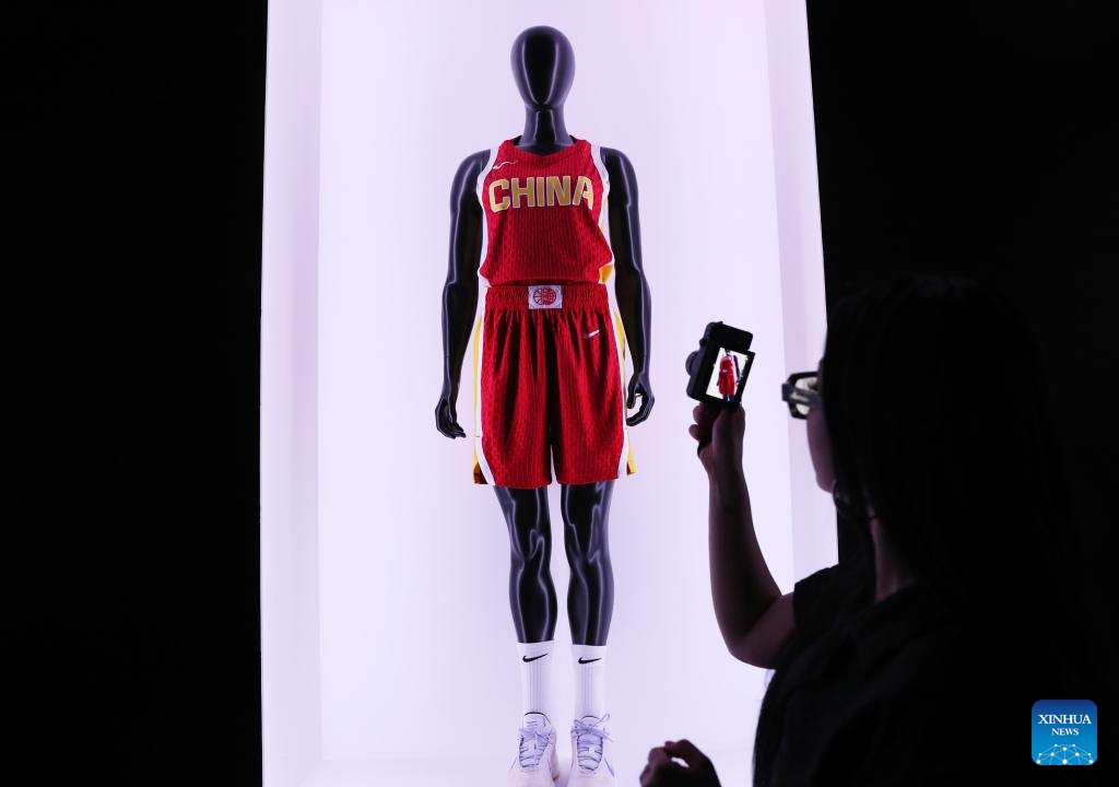 A visitor takes photos of Nike Olympics Products during a Paris Olympics kits unveiling event held by Nike in Paris, France, April 11, 2024. (Xinhua/Gao Jing)