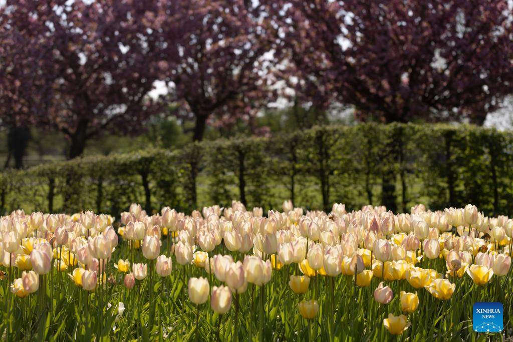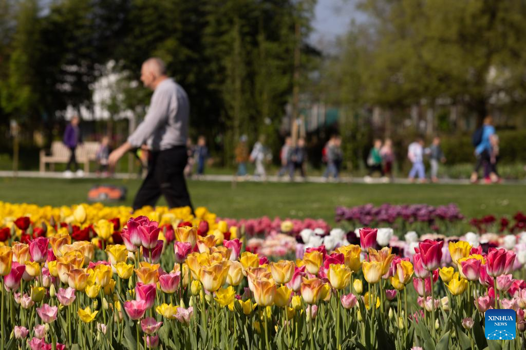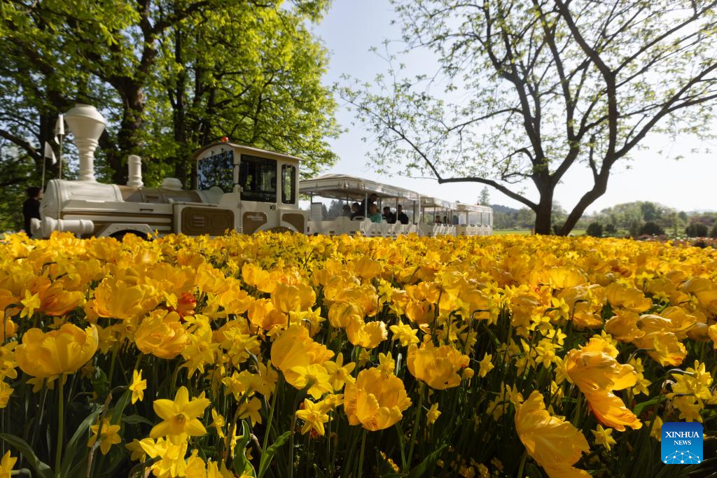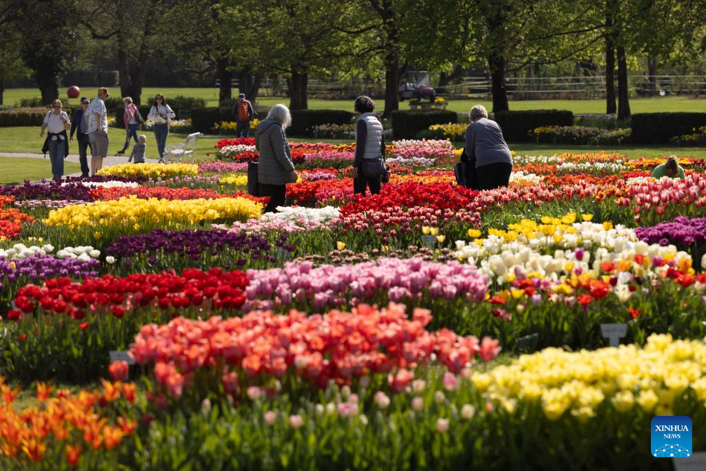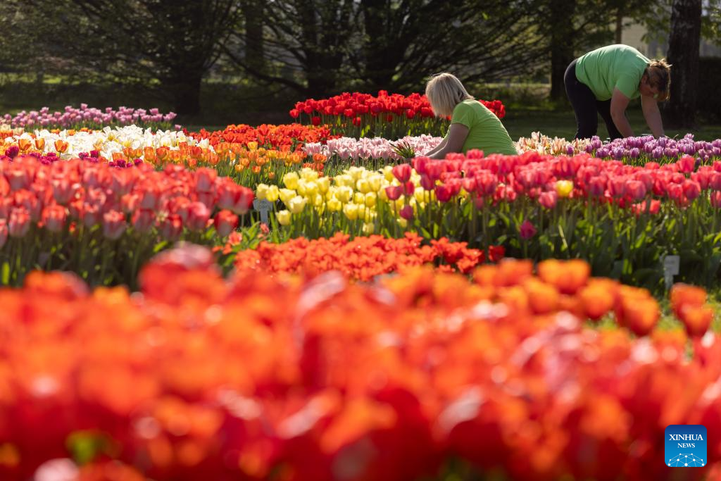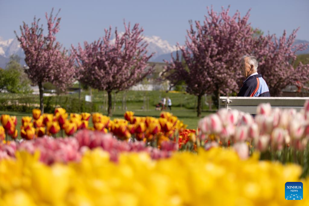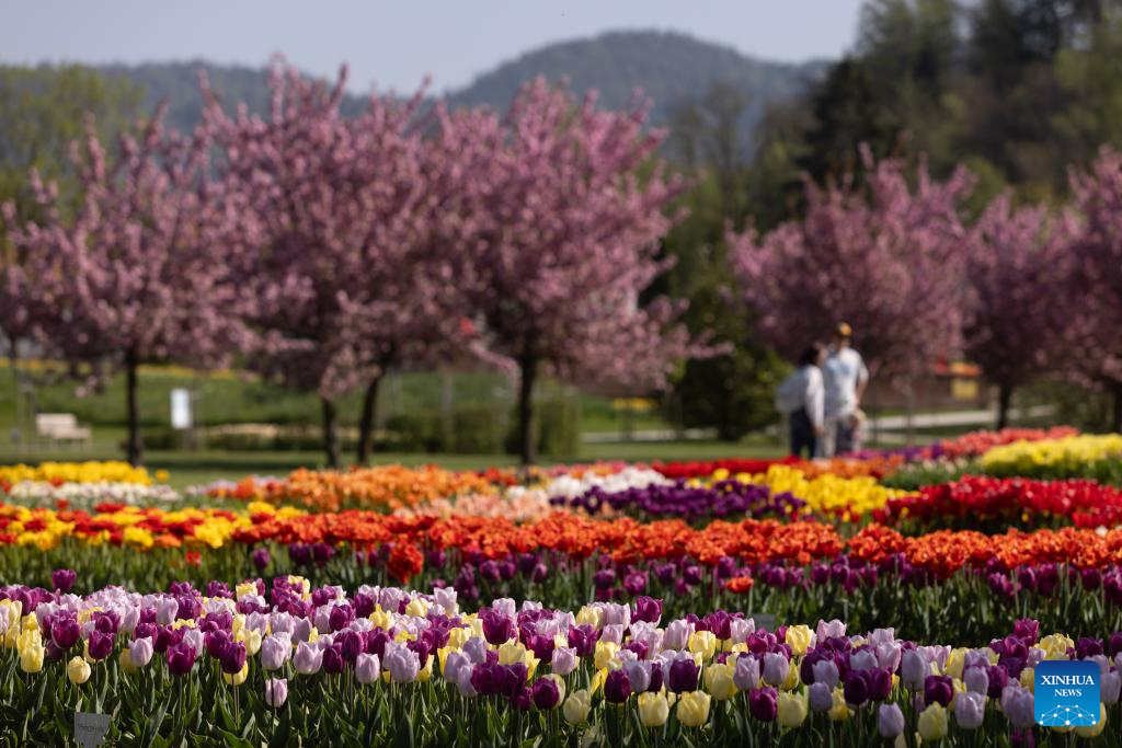 People enjoy the tulips at the Volcji Potok Arboretum near Kamnik, Slovenia, April 12, 2024. The traditional exhibition of spring flowers and tulips at the Volcji Potok Arboretum of Slovenia was marked by the bustle of people and the colorful palette of flowers. (Photo by Zeljko Stevanic/Xinhua)
