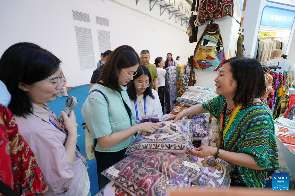 Visitors choose cushions made of Xinjiang cotton at the Xinjiang booth of the fourth China International Consumer Products Expo (CICPE) in Haikou, capital city of south China's Hainan Province, April 14, 2024. A batch of domestic brands have attracted a lot of visitors at the expo. (Xinhua/Li Mengjiao)