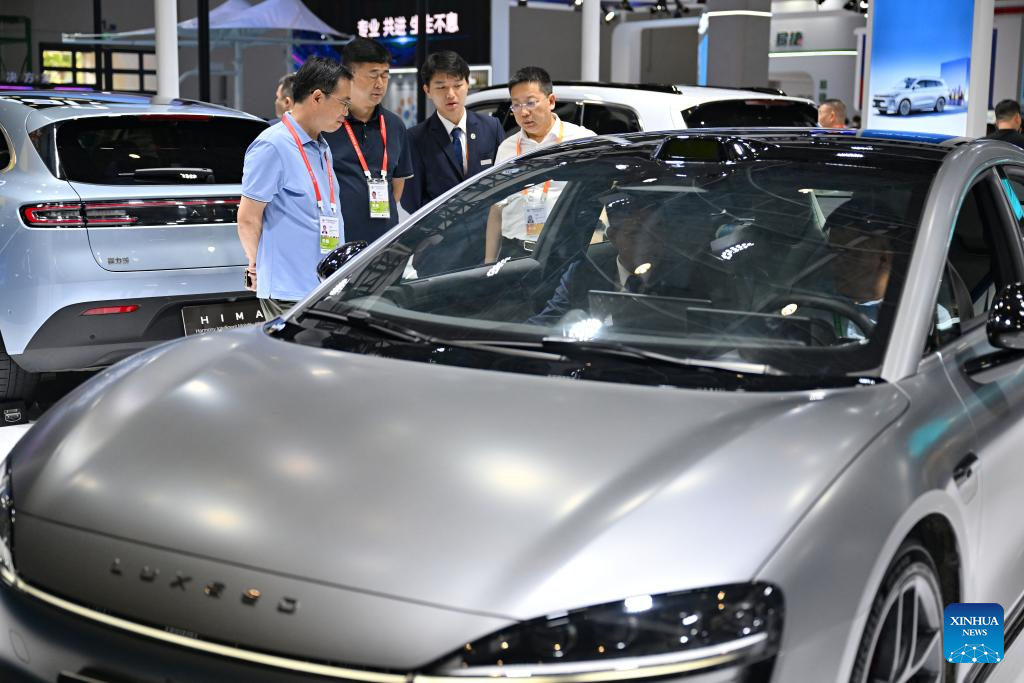 Visitors view a domestic new energy vehicle at the fourth China International Consumer Products Expo (CICPE) in Haikou, capital city of south China's Hainan Province, April 13, 2024. A batch of domestic brands have attracted a lot of visitors at the expo. (Xinhua/Guo Cheng)