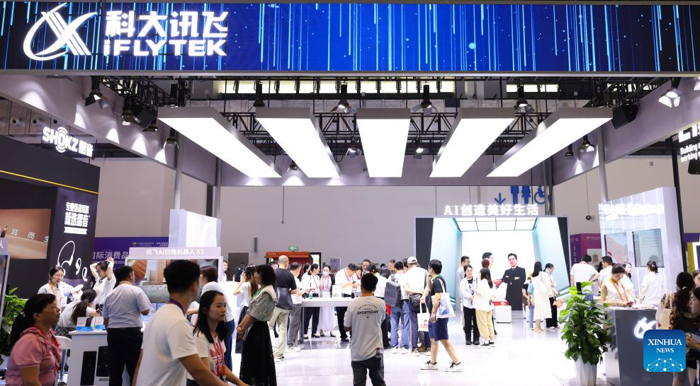 Visitors are seen at the booth of iFLYTEK at the fourth China International Consumer Products Expo (CICPE) in Haikou, capital city of south China's Hainan Province, April 14, 2024. A batch of domestic brands have attracted a lot of visitors at the expo. (Xinhua/Yang Guanyu)